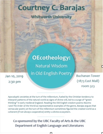 Oe began 2019 by hosting Dr. Courtney Barajas at the University of British Columbia where she gave a lecture on “Oecotheology: Natural Wisdom in Old English Poetry.” Her talk explored what she terms a “surge of ‘green thinking’” in early medieval England and offered readings of Old English wisdom poems.