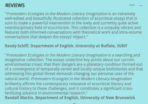 Oecologies is especially proud to welcome into print the first publication emerging from the network. Growing from the conference jointly hosted at the University of British Columbia and Simon Fraser University in 2015, Premodern Ecologies in the Modern Literary Imagination features essays by members and collaborators (Robert Rouse, Jeffrey Jerome Cohen, Patricia Badir, Louise Noble, Sarah Crover, Frances E. Dolan, Louisa Mackenzie, Sharon O’Dair, David Coley, Sandra Young, Scott MacKenzie, David Matthews, and J. Allan Mitchell) with an afterword by the prominent ecocritic Ursula K. Heise. You can read more about it at the University of Toronto homepage.