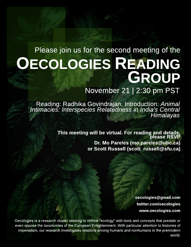 We are proud to announce the second meeting of the Oecologies reading group, to be held on November 21st at 2:30 pm PST. Our reading for this meeting will be the introduction to Radhika Govindrajan’s Animal Intimacies.