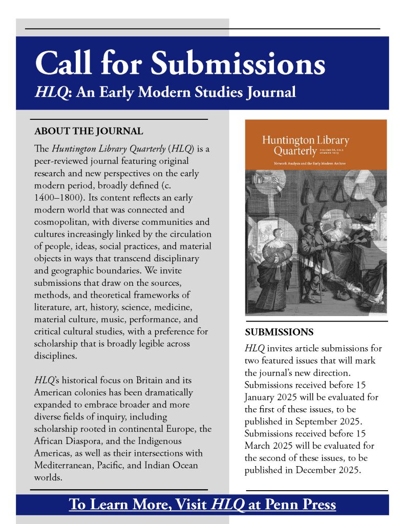 The Huntington Library Quarterly (HLQ) is a peer-reviewed journal featuring original research and new perspectives on the early modern period, broadly defined (c. 1400–1800). Its content reflects an early modern world that was connected and cosmopolitan, with diverse communities and cultures increasingly linked by the circulation of people, ideas, social practices, and material objects in ways that transcend disciplinary and geographic boundaries. We invite submissions that draw on the sources, methods, and theoretical frameworks of literature, art, history, science, medicine, material culture, music, performance, and critical cultural studies, with a preference for scholarship that is broadly legible across disciplines.